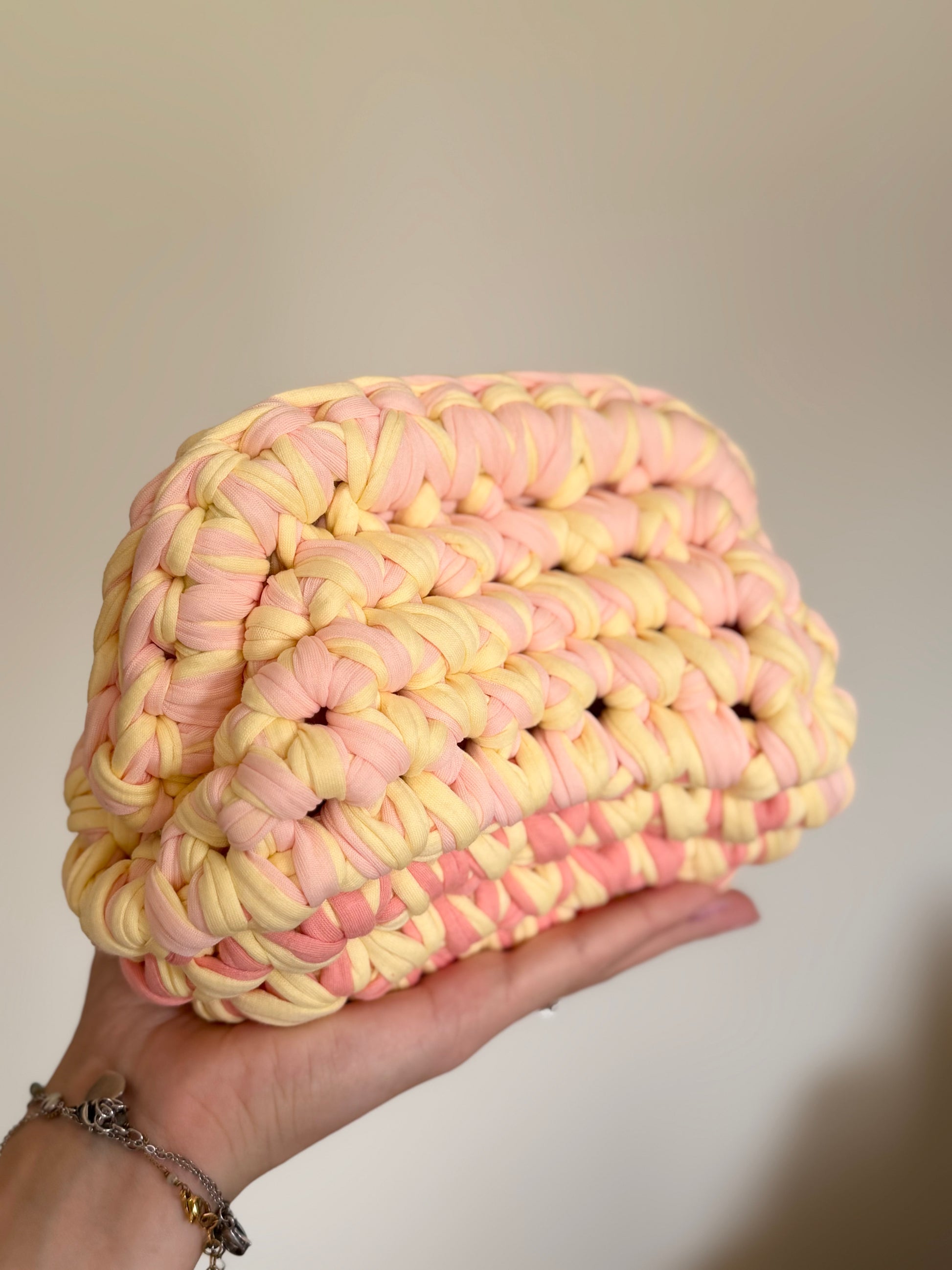 Le tonalità delicate del giallo tenue e rosa chiaro si fondono in un abbraccio luminoso e raffinato, perfetto per chi ama i dettagli femminili e discreti.