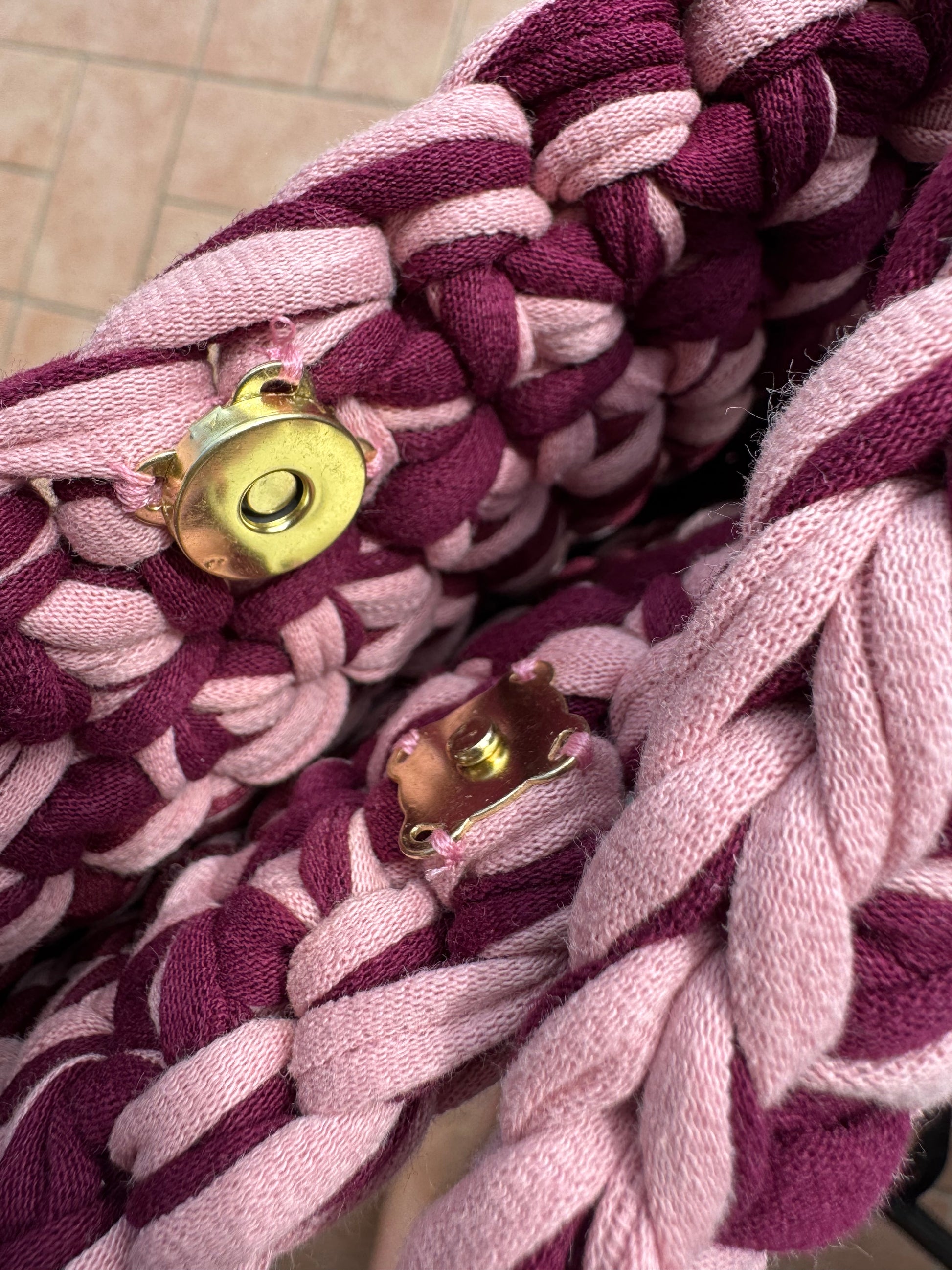Le tonalità bordeaux e rosa cipria si fondono con delicatezza, creando un contrasto raffinato e femminile.