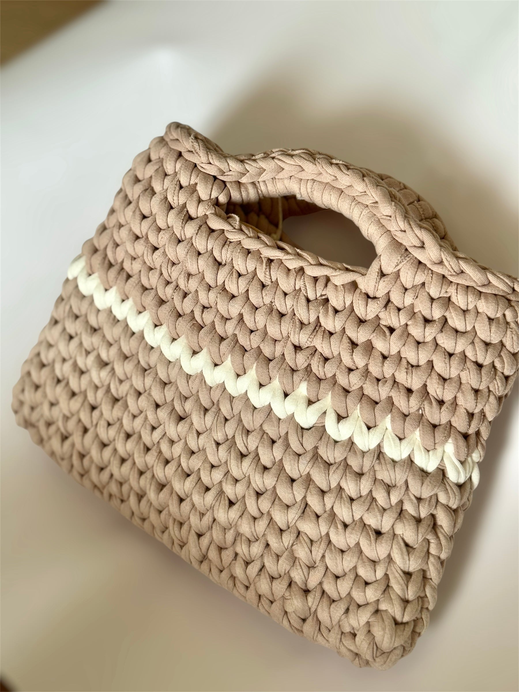 Realizzata interamente a mano con fettuccia riciclata in cotone.