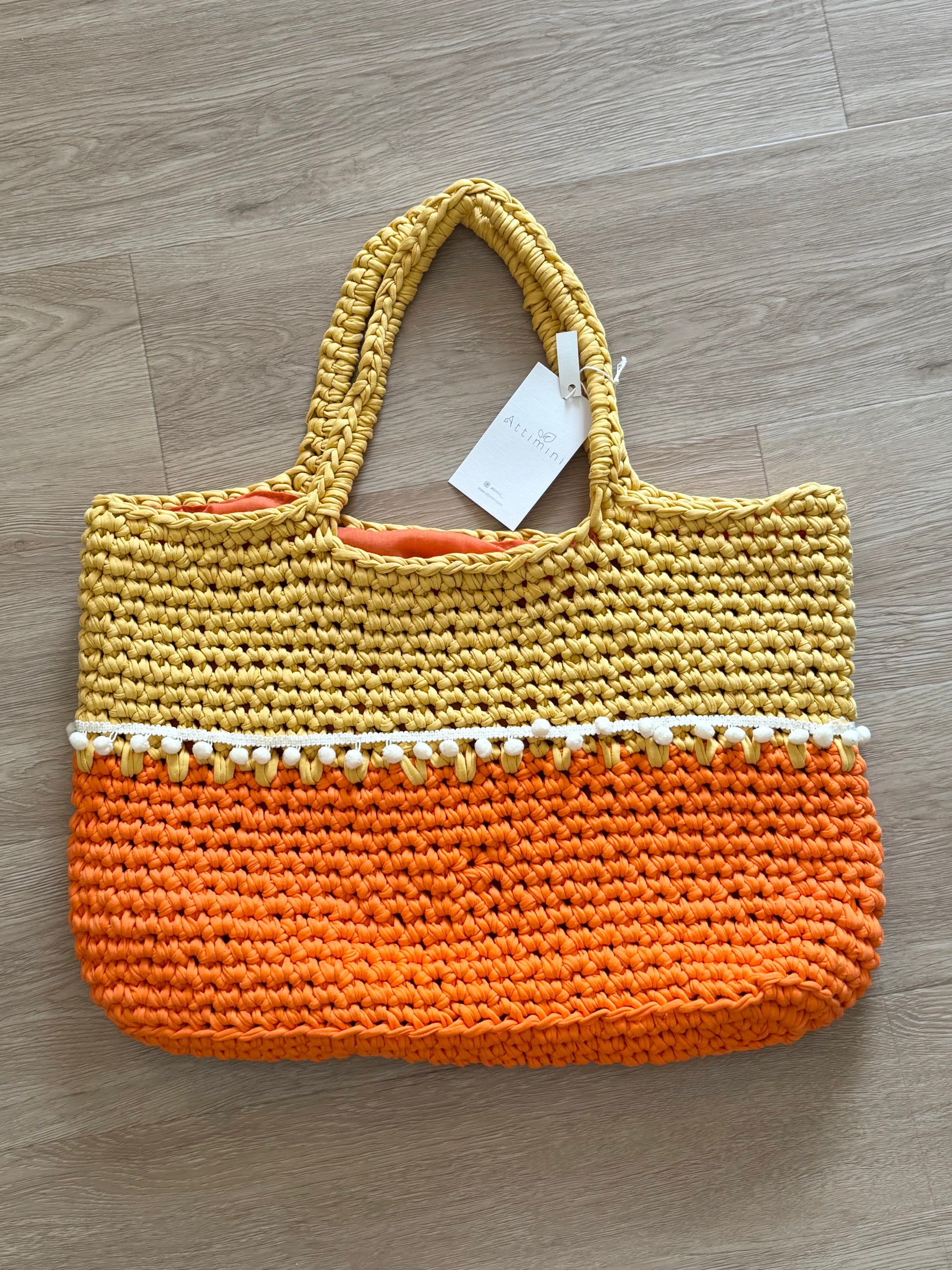 Realizzata a mano in fettuccia di cotone (95% cotone, 5% elastan), unisce praticità e stile grazie alle sue tonalità vivaci di senape e arancio, perfette per l’estate.