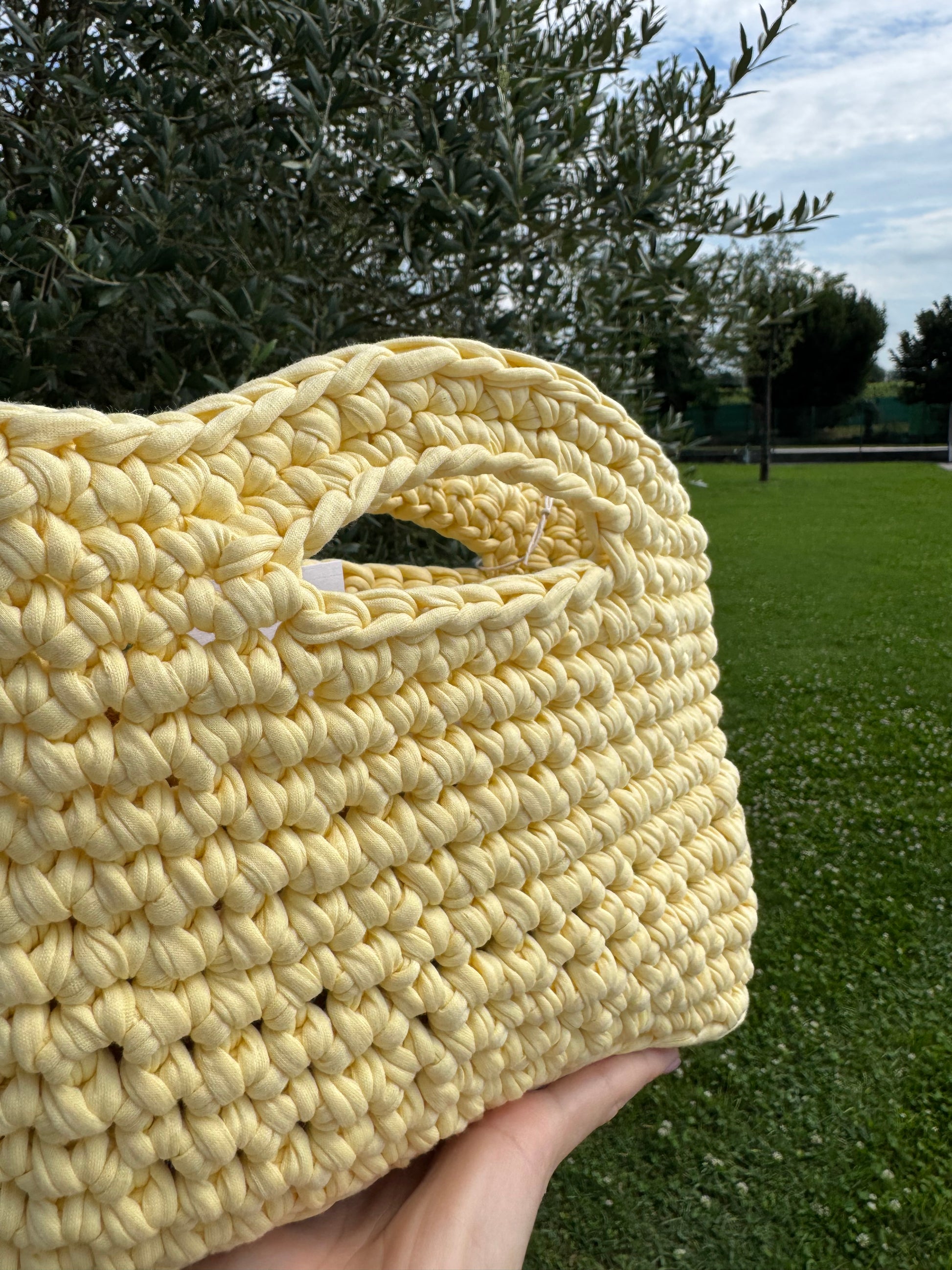 Semplice, luminosa e dal carattere delicato: questa borsa a mano è interamente realizzata a mano in fettuccia di cotone (95% cotone, 5% elastan).